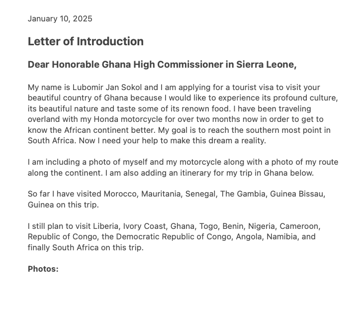 For your onward ticket, it is good to prepare a simple written pdf explaining your trip in French (use Google Translate if you don’t speak it), with photos of your vehicle and perhaps a trip map. You’ll need this anyways once you apply for the visas for Ghana, Nigeria and Cameroon anyways so you might as well get it ready now.